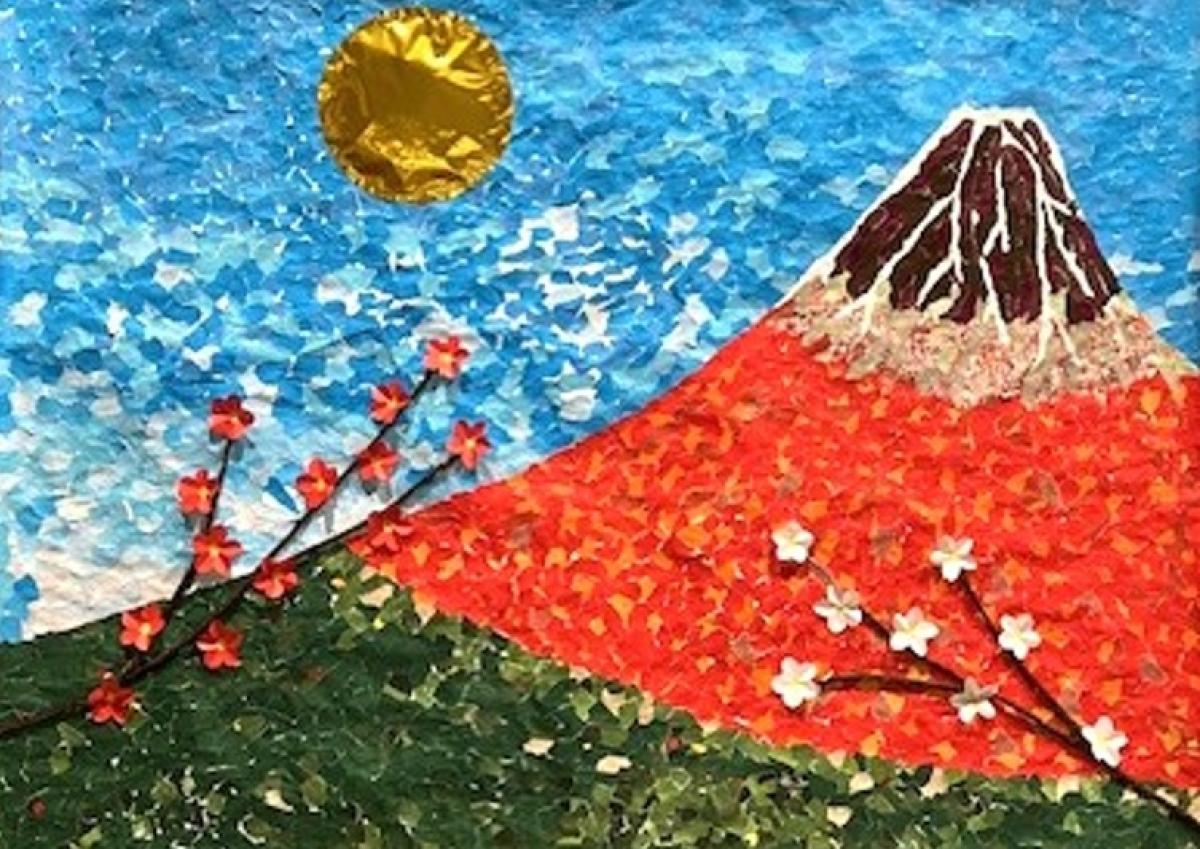 今月は、はり絵の「赤富士」を作成しました。新年を飾る相応しい作品です。金色の朝日が眩しいですね~