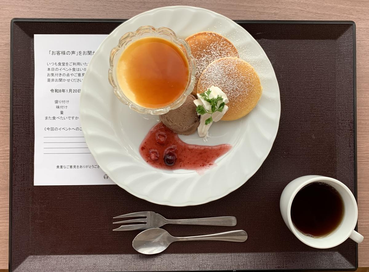 本日、冬のデザートフェアを開催致しました。手作りのパンケーキには、手作りのベリーソースとホイップクリーム、そしてチョコアイスとの相性が良くとっても美味しく頂きました。またお洒落なガラスの容器にはプリンが盛り付けられており、こちらもとても美味しかったです。