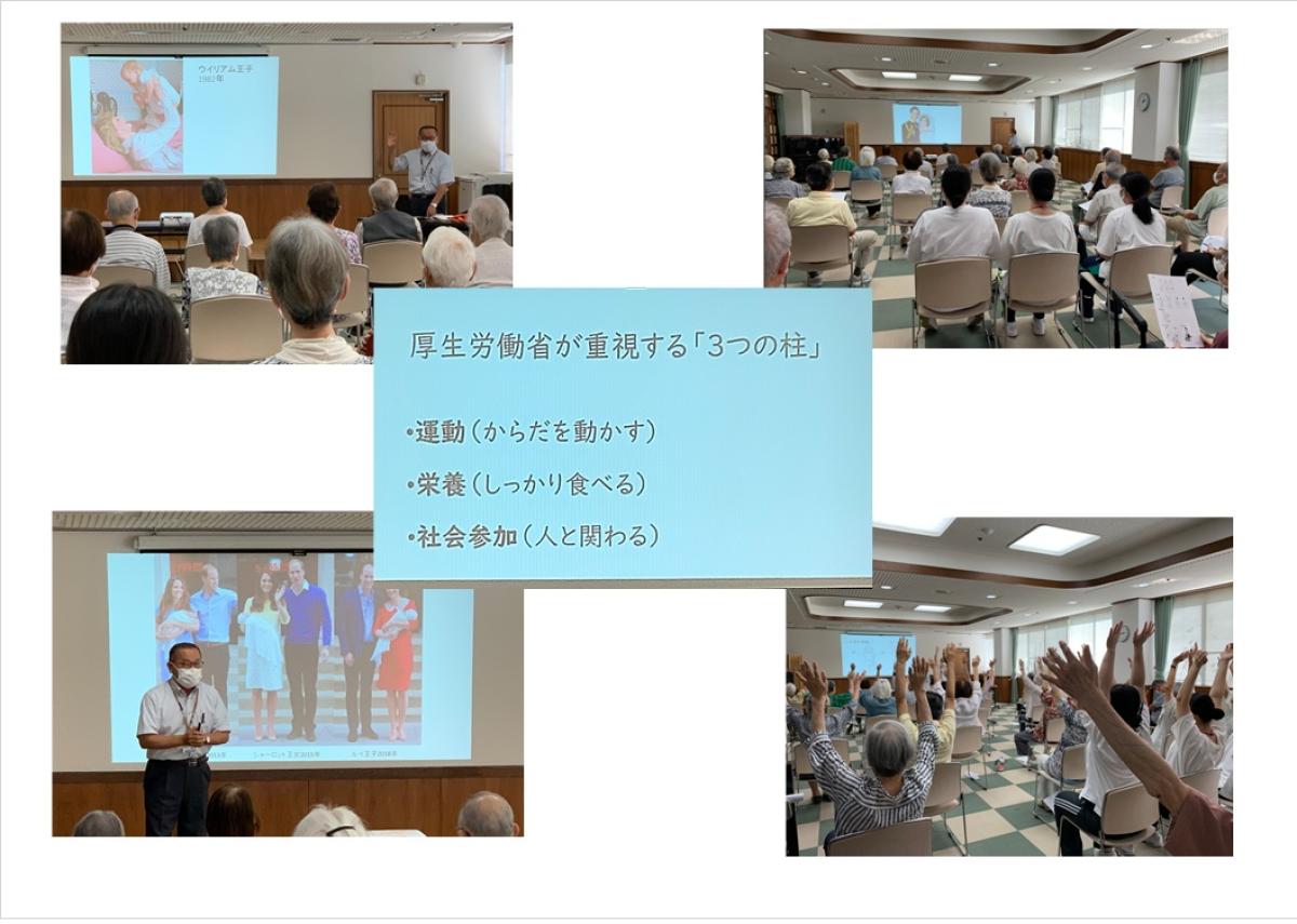 理学療法士の草分け的存在でも有り、慈恵会新須磨病院グループ「神戸総合医療専門学校」の学校長でもいらしゃる、鮫島一雄先生にお越し頂き「生活リハビリの重要性」と「自分で出来る介護予防体操」をご講演頂きました。明るく朗らかなお人柄が全面に出ている様な先生で、とても分かり易くお教え頂きました。ご入居者の皆様は“自立”を意識されている方が多くおられ、大勢の方がご参加されました。